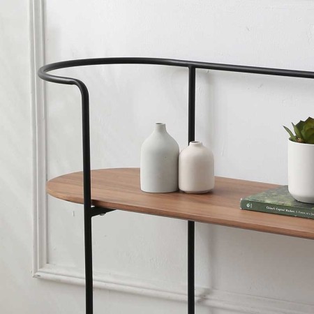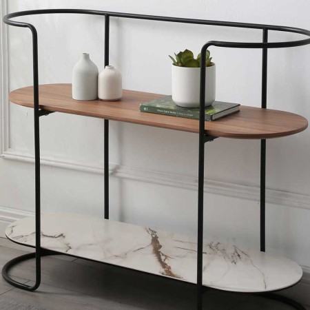 A la recherche d'un mobilier d'intérieur moderne, découvrez dans notre gamme de meubles la console CHLOE. Des lignes à la fois fluides et rétro mettent en valeur la simplicité du design. Le meuble est constitué d'un châssis en métal laqué époxy noir, l'étagère du bas est en céramique Golden Stone KL188 3mm sur collée sur verre trempé 6mm, l'étagère supérieure en panneaux de particules plaqués noyer.