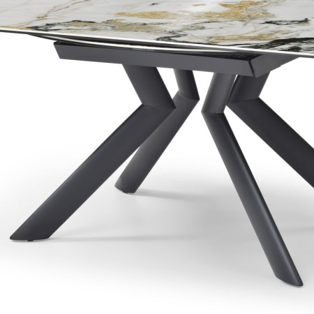 Vous cherchez une table repas à la fois belle et surprenante pour accueillir jusqu'à 10 personnes ? Découvrez la Table repas SOFIA 1800 Cold Jade avec son plateau céramique veiné cold jade, son piétement anguleux et la cinématique si particulière de son plateau qui transforme en un mouvement de main votre table rectangulaire en une table repas ronde. Châssis et piétement en métal noir, dessus et 2 allonges en céramique épaisseur 6mm collée verre trempé 8mm Céramiques disponibles : Cold Jade, Pandora, Travertin en 1,5m et 1,8m